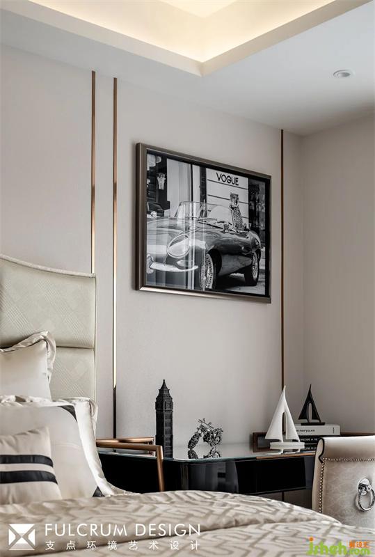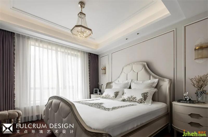 主臥延續(xù)客餐廳浪漫的英式風情,以深色復古木紋地板增添睡眠空間該有的沉穩(wěn)感受,高床軟枕,使睡覺更有儀式感。
