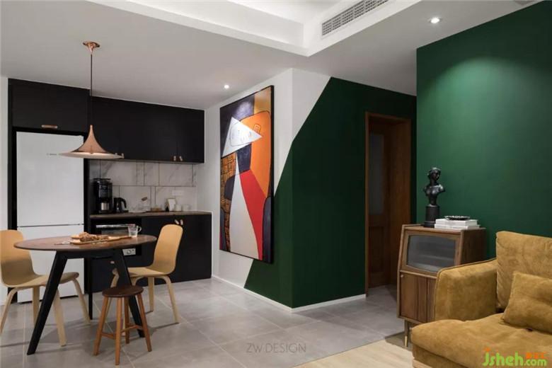通過地面材質(zhì)的區(qū)分,把通道的面積也劃給了餐廳,餐廳顯得大了許多。在墻體陽角做了斜切的分色,與巨幅抽象畫相得益彰,墨綠色乳膠漆與抽象畫的搭配帶來強(qiáng)烈視覺沖擊。