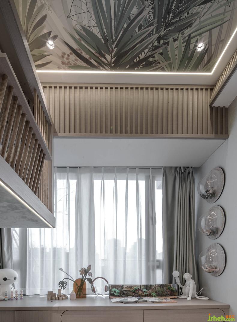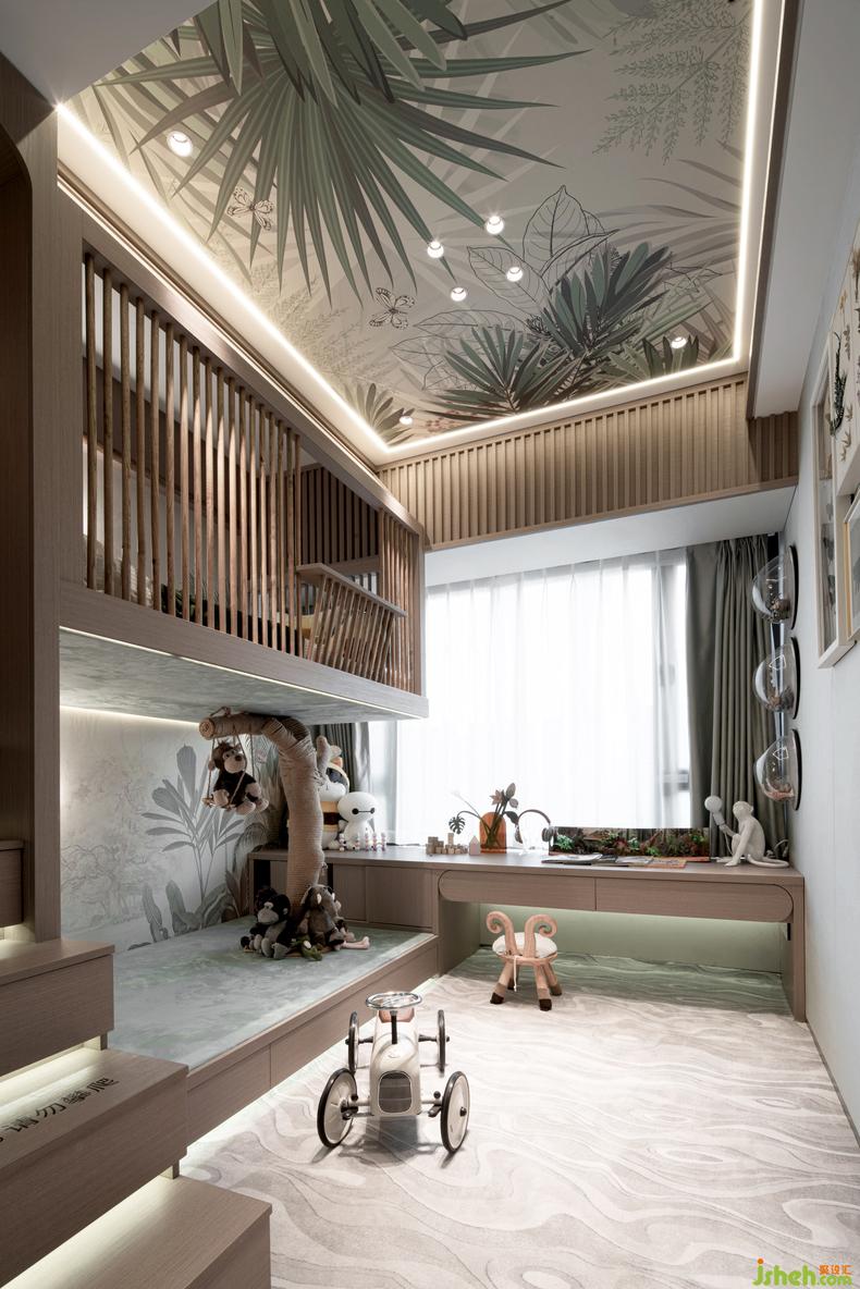 森林王國小王子臥室,結(jié)合了“樹屋”元素,運用樹林空間主題讓小王子置于森林,天花和墻面的定制主題墻紙貫通,在空間層上做立體構(gòu)成,在不同高度的空間里面探索森林的故事,體現(xiàn)男孩子的探索求知欲,樣板房設(shè)計在叢林中不斷發(fā)現(xiàn)不斷學(xué)習(xí),極具想象力的獨特表現(xiàn)手法,帶給新鮮的藝術(shù)體驗感和故事性,吊籠床充分利用了空間,形成天地墻的延續(xù)性,在吊籠床里,仿佛是孩子的搖籃,也可以通過吊籠床的窗戶立起望遠(yuǎn)鏡遙望外面的景觀,燈光方面,從而在不同的空間界面上構(gòu)筑成交錯的光影和變化。而下方休息區(qū)放置了秋千,讓小王子玩累了仿佛在森林里休息一樣。緊靠休息區(qū),延伸窗戶同等寬度的是學(xué)習(xí)區(qū),樣板房設(shè)計考慮到兒童的學(xué)習(xí)周期而設(shè)的充分臺面尺寸,也體現(xiàn)其學(xué)習(xí)樂趣,具有動靜結(jié)合的一面。