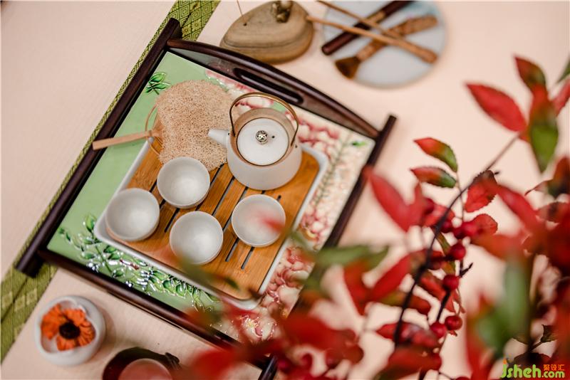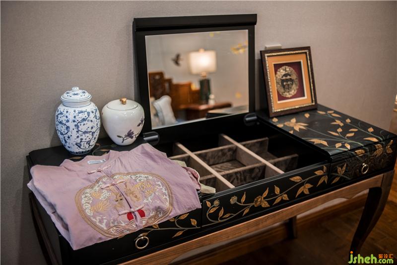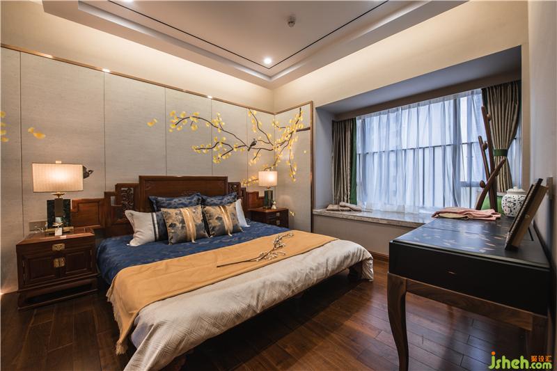 “疏影橫斜水清淺,暗香浮動月黃昏”。 主臥極具東方文化內(nèi)涵的梅花與元素,圓月梅花,滿載祝福之意。中式屏風(fēng)的背景墻搭配造型古樸的木床,營造采菊東籬的中式田園的閑淡意境。室內(nèi)設(shè)計師