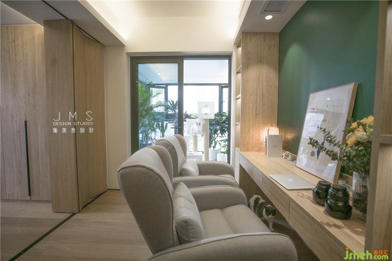 改造結(jié)束后的客廳充滿了日式的詩意和悠閑。木色的地板、閣柜、桌臺(tái),白色的軟包布藝沙發(fā)、柔軟的抱枕,以及一覽無余的潔凈墻面,點(diǎn)綴著淡雅的綠色,簡單的裝置和鋪陳,空間的雅致彰顯,讓擁擠浮躁的內(nèi)心也有了留白。原木色的通道嵌入流動(dòng)的燈光隔開外界與室內(nèi),營造如自然般的光感呈現(xiàn),匆匆前行的腳步也在這里開始變緩。