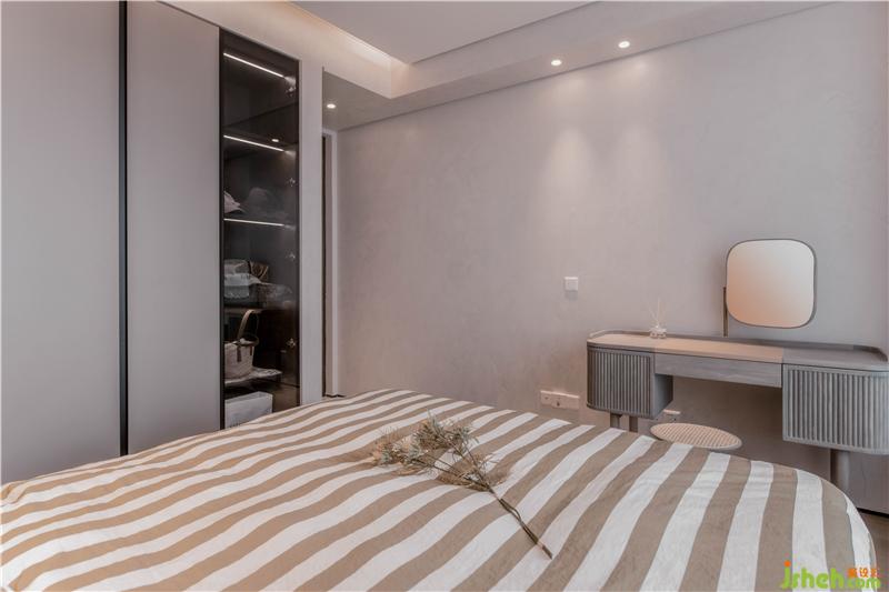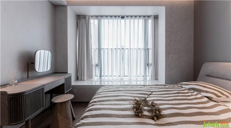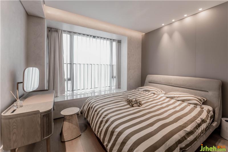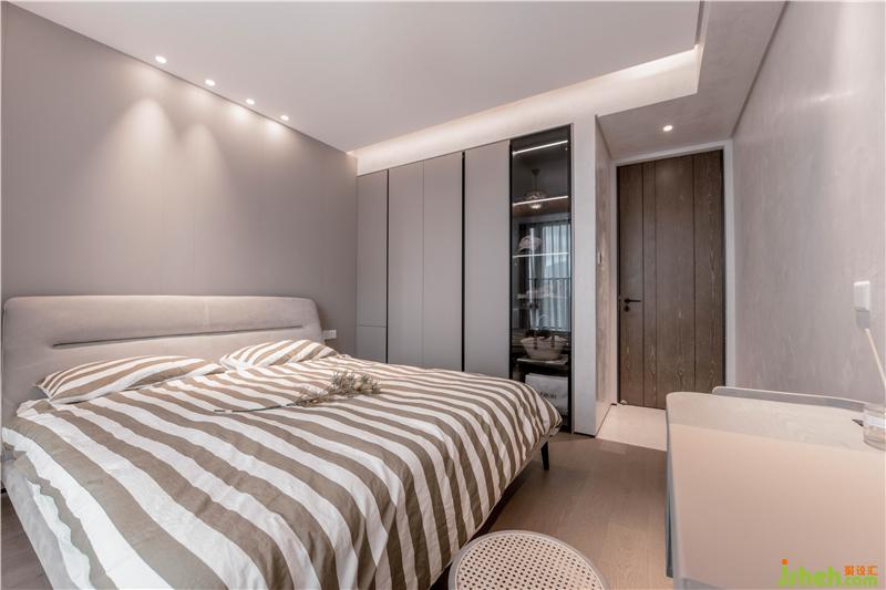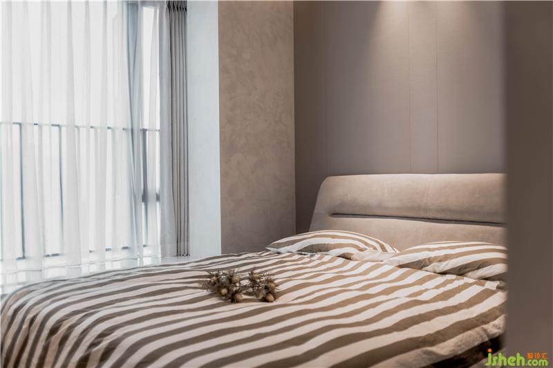 進(jìn)入主臥室,天花及壁面維持統(tǒng)一的干凈質(zhì)感,通過灰棕色系烘托溫馨氛圍。