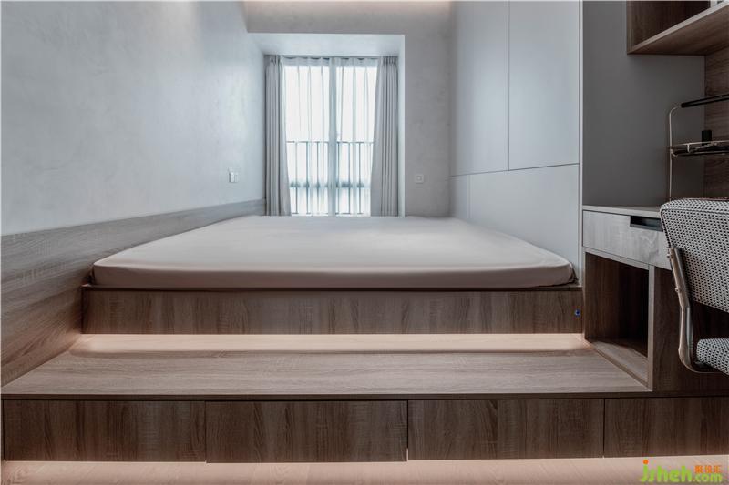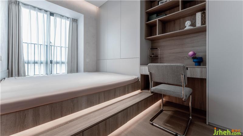 考慮到本身空間面積有限,在側(cè)臥的處理上,設(shè)計師設(shè)計了大量的收納空間。大型收納柜化身為白墻,墊高榻榻米的階梯還藏著多個抽屜。本著不浪費每一處空間的準(zhǔn)則,滿足了業(yè)主的日常生活收納需求。