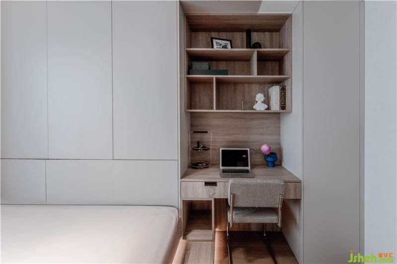 側(cè)臥與書房相結(jié)合,在沒有客人來家里時,側(cè)臥就變成了業(yè)主的私人辦公領(lǐng)域。設(shè)計師將書桌嵌入墻體,搭建書寫區(qū),擴大視覺的空間感。