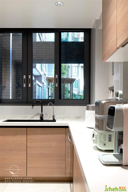 廚房中設(shè)置了許多的儲物柜,方便業(yè)主在廚房收納瑣碎的雜物,顯得整體空間干凈整潔。