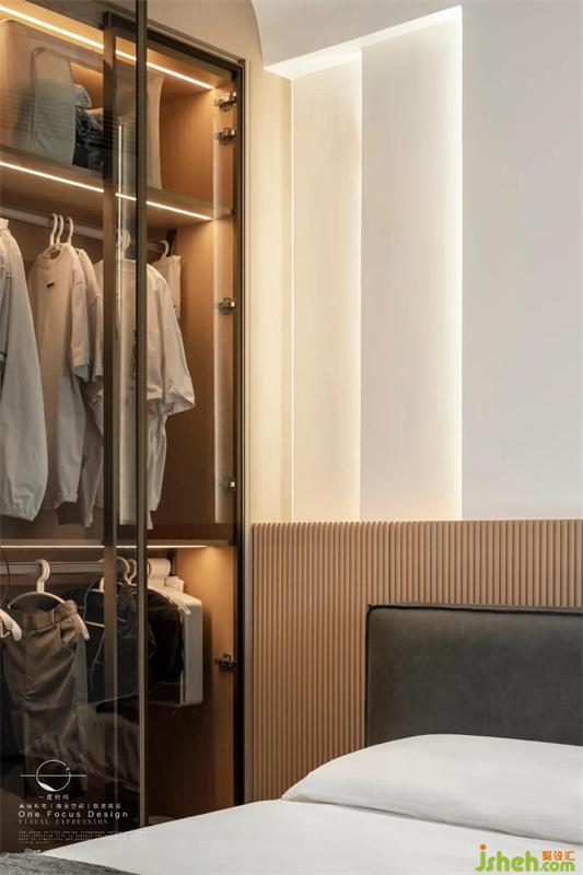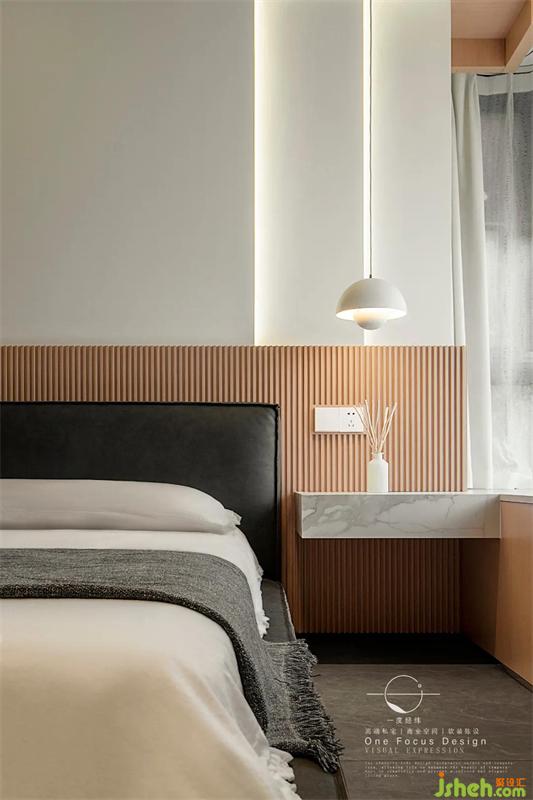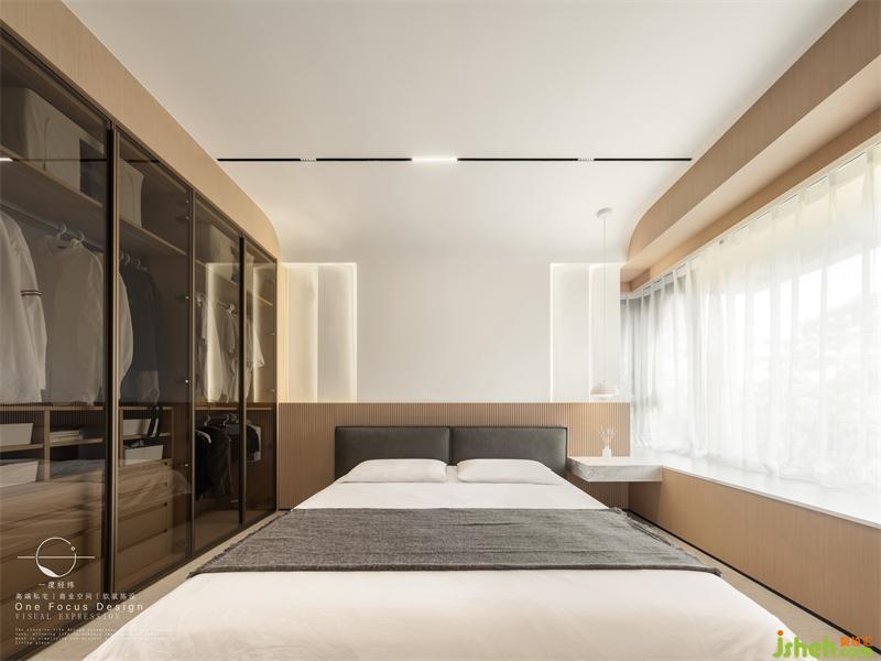 取自然的色調(diào)與質(zhì)感,寬闊的雙人床,層次錯落的床頭背景墻、精致實用的透明衣柜,彰顯出對細(xì)節(jié)的完美把控。大量的留白空間讓視覺放松下來,陽光照射在室內(nèi),瞬間將現(xiàn)代社會快節(jié)奏的煩擾褪去一二,在家中為自己覓得一塊精神綠洲。