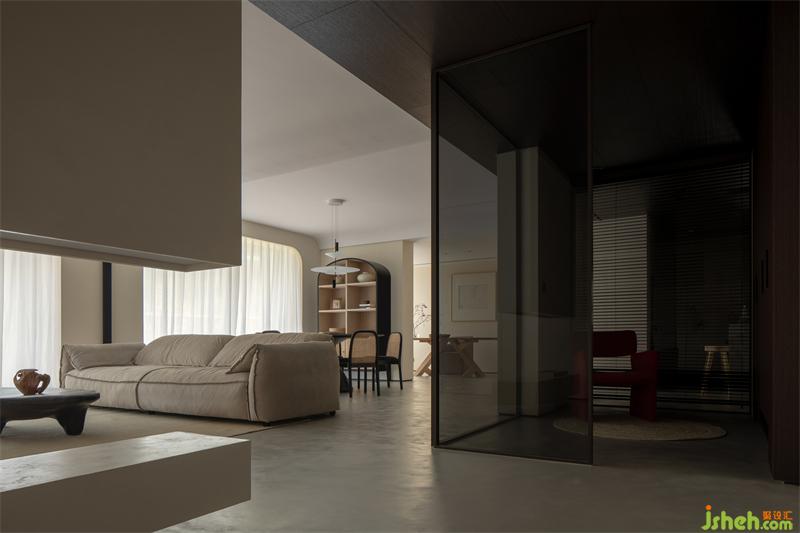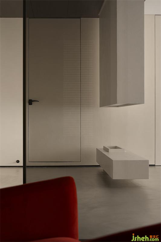 半懸空玄關(guān)隔斷與入戶鞋帽間、視聽室并置而設(shè):主人回家,白天工作情緒轉(zhuǎn)換之余,家人相互之間可以感受到彼此的動(dòng)態(tài),而不驚擾。賓客友人進(jìn)出視聽室經(jīng)過玄關(guān)時(shí),可以感受到人的活動(dòng),而避免了眼神對視。