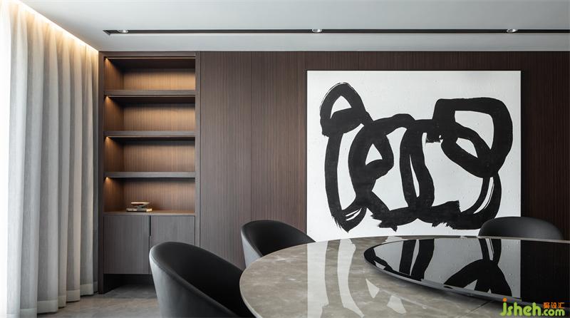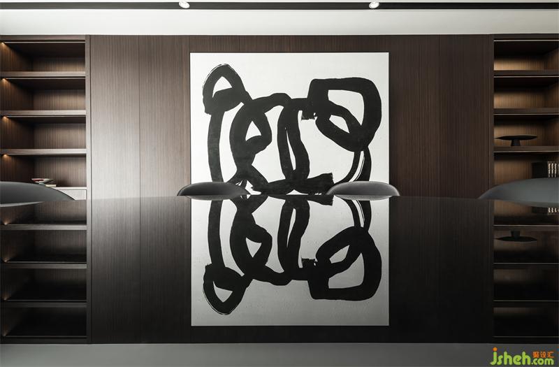 品酒區(qū),透明的酒柜與舒適的家具遙相呼應,呈現(xiàn)適合摯友輕松交談的愉悅氛圍。穿過品酒區(qū)進入餐廳,餐廳與露臺連接,明亮的光線使整體視野通透無比?,F(xiàn)代的藝術書法令人眼前一亮,打破了木色的深沉基調。