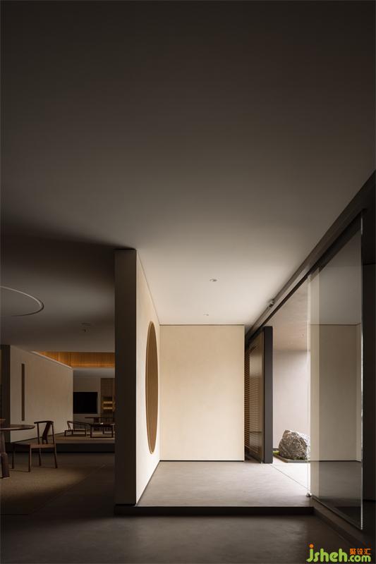 欲退而有余地,有余地則有空間。整體立面的退斂、標(biāo)識(shí)發(fā)光效果的褪卻、置一椅以隱示空間屬性的克制,并非技巧與風(fēng)格取向的忖度,而皆源自設(shè)計(jì)師對(duì)薈舍品牌精神之理解、體悟與凝塑:欲退而不爭,不爭而心寧,心寧則靜。欲退而靜。