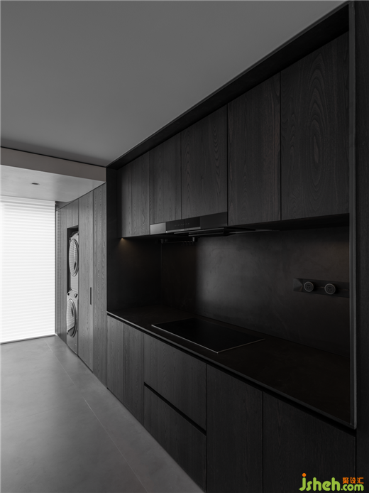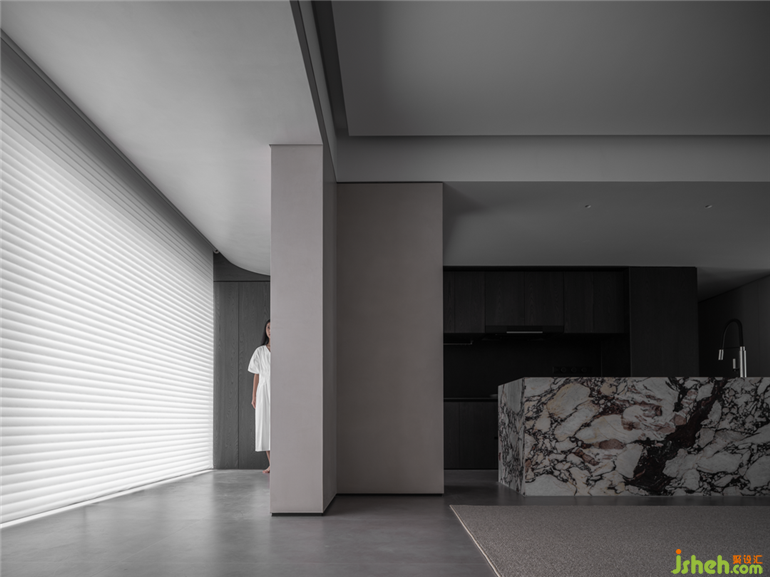 私宅設(shè)計(jì)整體構(gòu)思上是對(duì)主人生活的一次歸整與主人性情的一種隱約表達(dá)。日常生活活動(dòng)的大多數(shù)功能性設(shè)計(jì)和設(shè)備,都被盡可能地嵌入空間骨架,與空間融為一體,需要時(shí),可便于主人使用,不需要時(shí),只有空間和人。