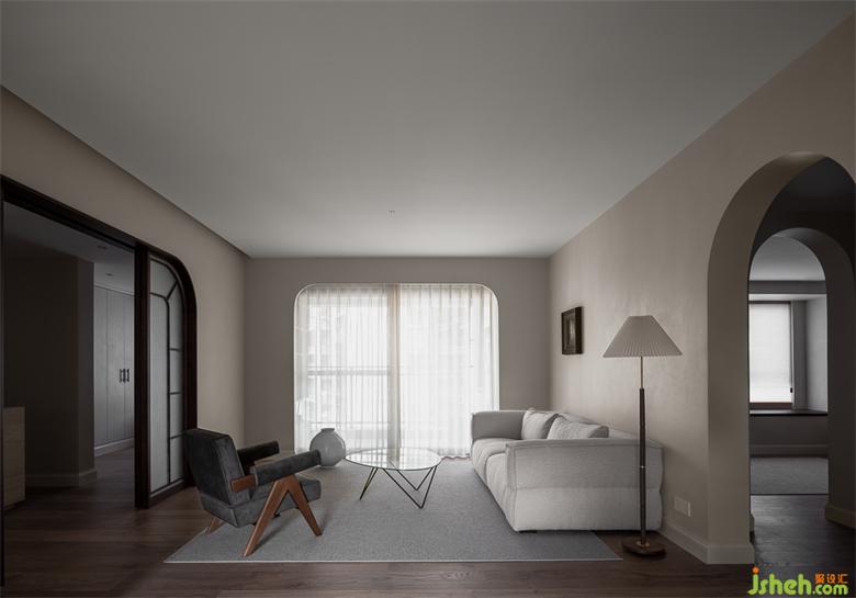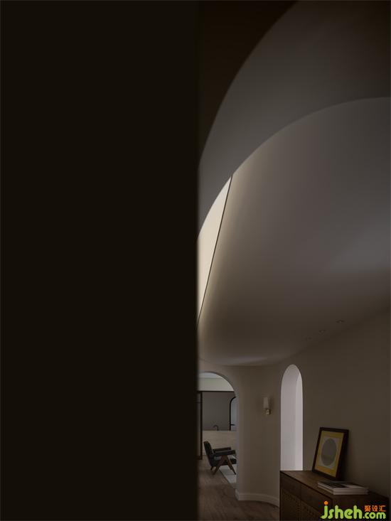 因主人工作長(zhǎng)時(shí)間都處于一種消毒水夾雜金屬的氣味之中,且獨(dú)居生活。故,設(shè)計(jì)師團(tuán)隊(duì)將空間的空氣流通性、采光性和空間氛圍的紀(jì)念意義、自由性、安全感作為設(shè)計(jì)的基本考量點(diǎn)。比如:將原來(lái)采光與通風(fēng)不佳的次臥,改為由兩扇拱門組成、半開(kāi)放的、兼具收藏、觀影、游戲的多功能空間,一方面作為主人展陳藏品的專屬空間,一方面滿足主人下班回家觀影的日常生活習(xí)慣,也為朋友偶爾在這里游戲提供了空間;援引靈感來(lái)自彩虹、具有藝術(shù)紀(jì)念意義的拱門形制連通主體空間,起居室與臥室通過(guò)一扇四聯(lián)拱形門形成自然區(qū)隔,并于客廳門窗造型形成呼應(yīng),人文與自然、古典與現(xiàn)代、虛實(shí)相生。家裝設(shè)計(jì)主人平日相中的古董器物藏品皆可任意置于某處,沏一杯熱茶,席地而坐,或把玩擺弄一番;或凝思格物,心流涌動(dòng);或僅是在物、心之間隙中體驗(yàn)?zāi)撤N荒謬、怪誕、虛無(wú)和無(wú)意義。再者,臥室與盥洗區(qū)同樣以弧形拐角墻體延申連接,以及弧形抹角的方形開(kāi)窗,用以柔化空間,不著痕跡地在主人臨睡前向其釋放一種踏實(shí)、放松、安全的心理暗示,得一夜無(wú)夢(mèng)好眠。以上,不一而具。