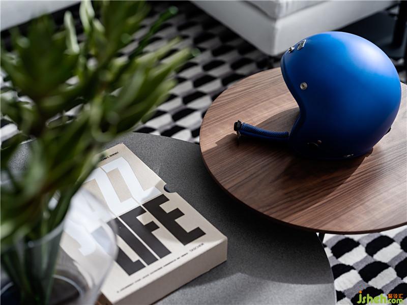 房間采用跳躍的色彩搭配,營(yíng)造出年輕活力的氛圍。寶藍(lán)色軟裝配色的使用令整理空間秩序感更強(qiáng),家具中大膽啟用了金屬、大理石、瓷磚等材質(zhì),并從展示了主人環(huán)游世界的不同收藏,酷勁與優(yōu)雅并存。