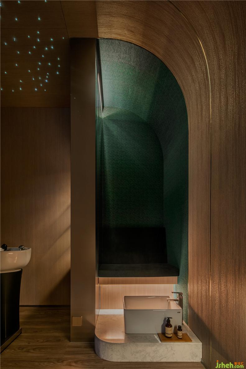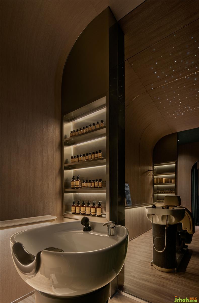 設(shè)計師堅信愉快的消費體驗來自無微不至的細節(jié):咨詢室以列車餐車為設(shè)計靈感,如同兩三摯友暢談聊天,打破了零售空間中常見的買賣對立的關(guān)系,其中氛圍,好似列車經(jīng)過隧道,車廂亮著壁燈的溫暖場景;而展示產(chǎn)品的壁龕,也以列車中餐車的形式展現(xiàn)。進入護理區(qū)域,浴足座位再現(xiàn)軟臥包廂的感覺,天花則處理成半弧形,當客人護理時,躺臥于沙發(fā)座椅上,室內(nèi)設(shè)計師視線接觸比較多的天花,所見是若明若暗的星空。
