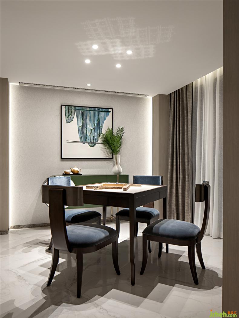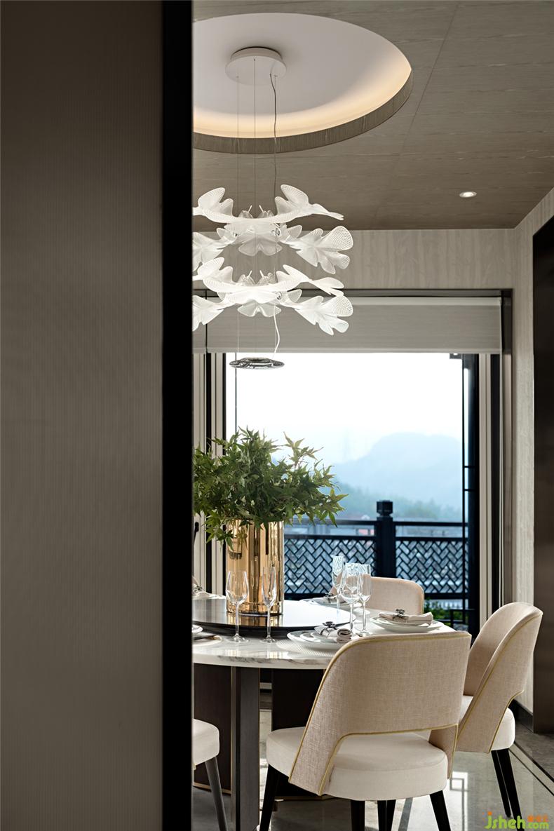客廳中青山藝術(shù)畫充分表達(dá)平靜自在的心境,“峽里誰知有人事,世中遙望空云山?!睆目蛷d的落地窗向遠(yuǎn)處眺望,天空澄碧、纖云不染,遠(yuǎn)山含黛、和風(fēng)送暖。畫與景融為一體、美輪美奐。