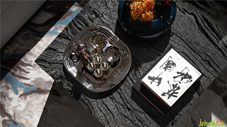 藝術(shù)還表現(xiàn)在家具和一切家居擺設(shè)上:餐廳中意大利Artimide吊燈有著花朵空中翻飛的形態(tài);書房家具的形態(tài)致敬了羅馬尼亞雕塑家Constantin Brancusi的經(jīng)典作品
