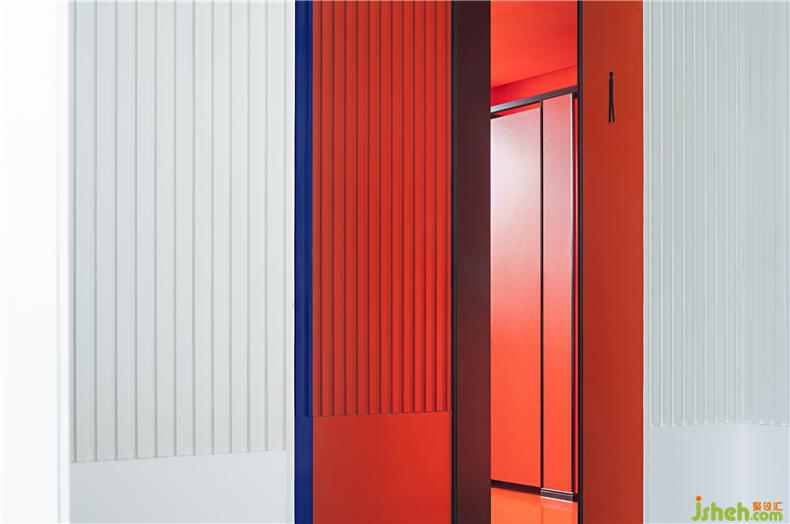 色彩的應(yīng)用無疑也是空間內(nèi)的特點(diǎn)之一,洗手間設(shè)計(jì)師通過對品牌基色的搭配組合,強(qiáng)烈顏色藍(lán)紅色調(diào)的對比來區(qū)分男女使用區(qū)域,這樣的處理方式帶來更豐富的視覺沖擊變化,也給注重效率的灰白空間帶來一抹藝術(shù)感。
