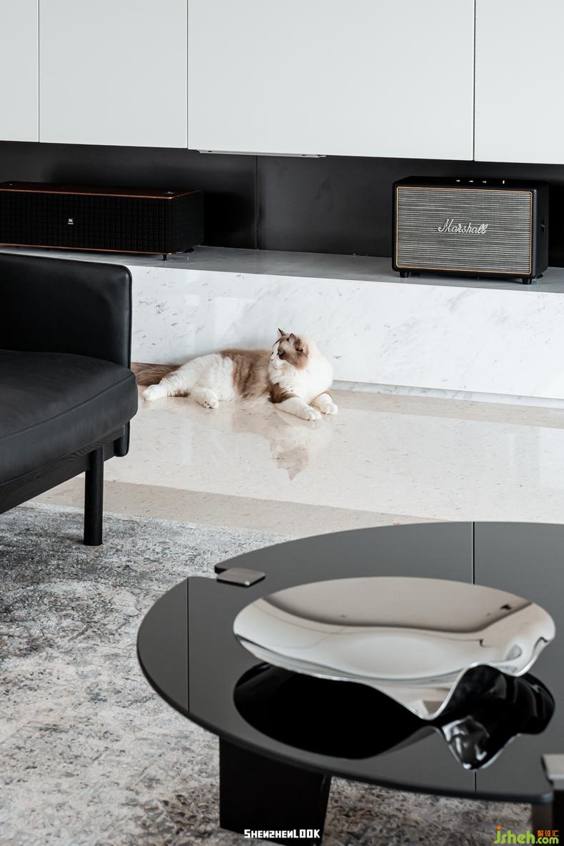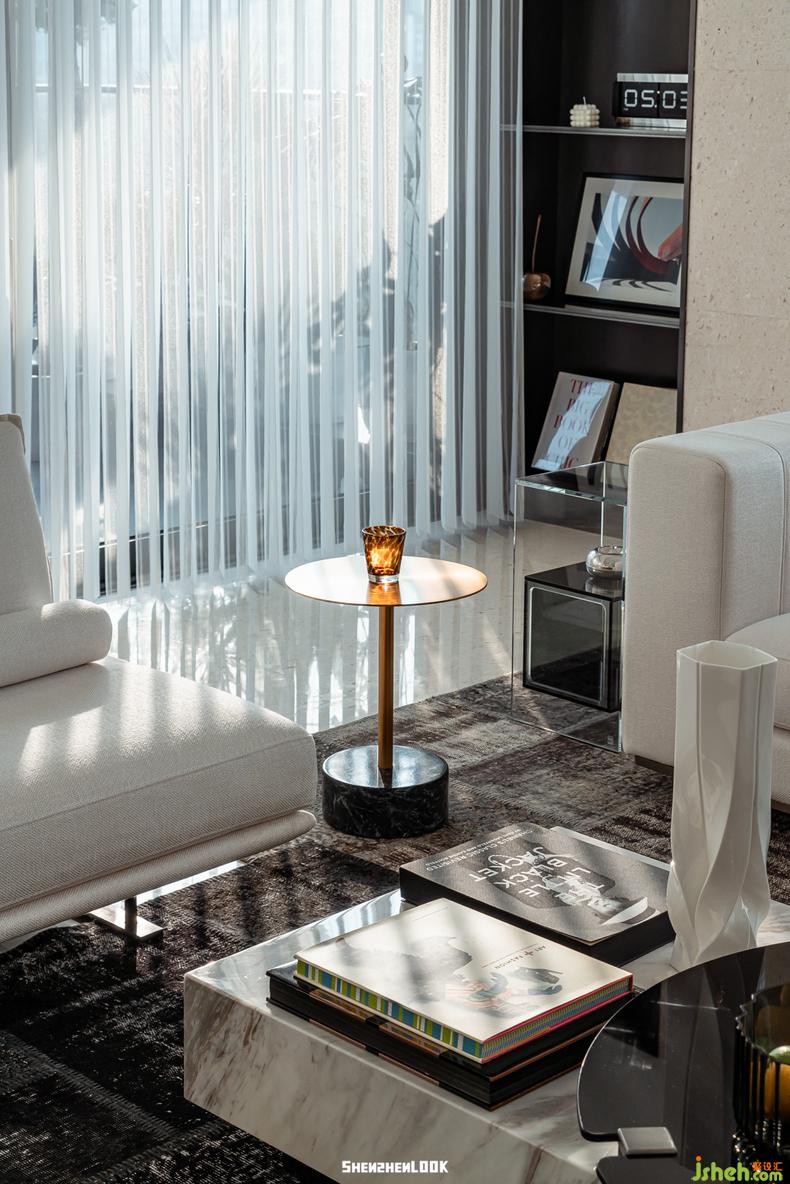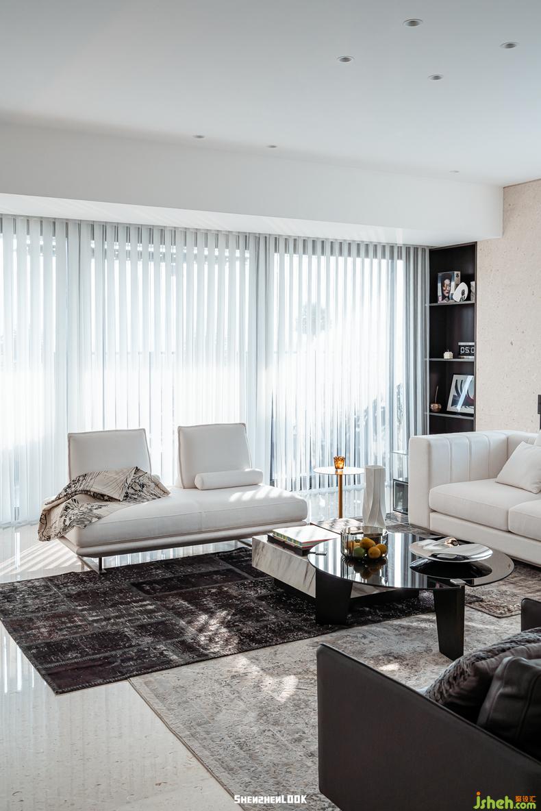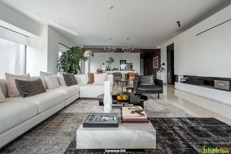 走進李先生的家,對白色產生的空間感有非常直觀的感受,豪宅設計大面積留白的視覺沖擊力非常震撼,寬敞自由,讓內部空間更有延展性?!绊斕炝⒌亍钡穆涞夭晒獠A?,讓室外景觀穿越空間,穿透力十足。在光影的作用下,白色的空間不顯冷淡,反而溫潤如玉,干凈通透。