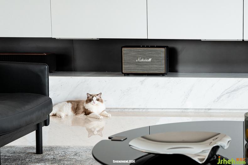 在客廳看似平常的墻面藏著設(shè)計(jì)師的巧思,豪宅設(shè)計(jì)需要遙控器打開(kāi)隱藏在墻后的電視機(jī),與沙發(fā)后面的單立音響是一整套BOSE家庭立體影院,以及聽(tīng)音樂(lè)專(zhuān)寵丹麥頂級(jí)音響品牌B&O,這是屬于李先生喜歡音樂(lè)、喜歡收藏音響的生活情調(diào)。