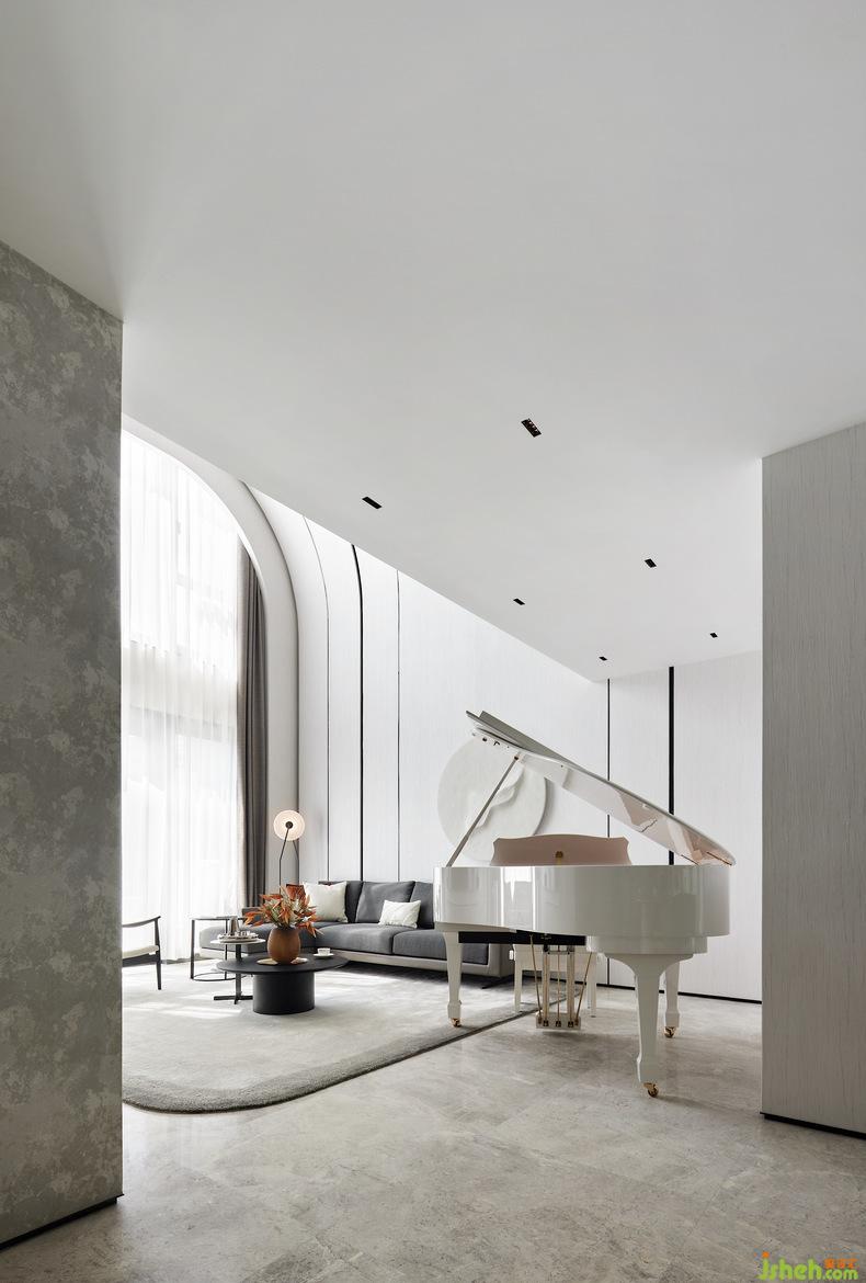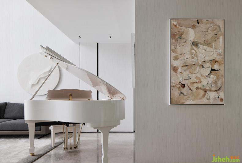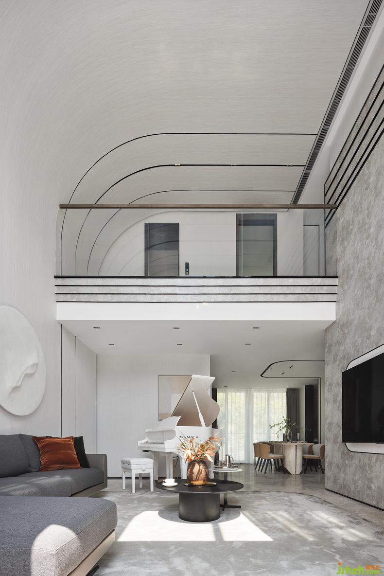 在整個(gè)客廳挑空的空間,隨著線條伸展的方向,空間力量乍現(xiàn),別墅設(shè)計(jì)空間感與節(jié)奏感不言而喻。從二層到一層傾瀉而下的整面落地玻璃將自然光引入,再經(jīng)過室內(nèi)中三角琴帶來(lái)的悠揚(yáng)奏鳴曲,氛圍被重構(gòu),讓藏在光影變化和相互作用中的歡快與跳躍感幻化出不同的畫境,同時(shí)增加了整個(gè)房子的藝術(shù)氣息。