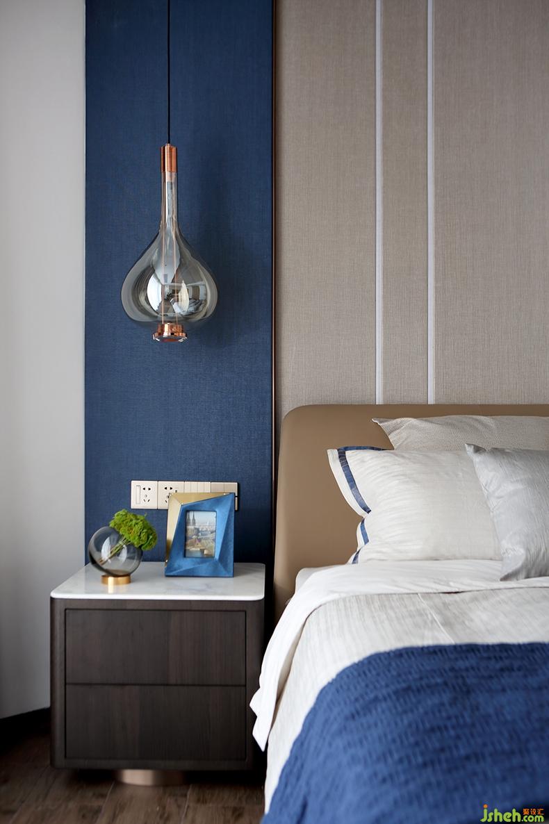 臥室以藍(lán)色為空間主色調(diào),如同海洋般的寧?kù)o深邃,塊面與線條的組合穿插,塑造出整體協(xié)調(diào)感及韻律感,也模糊了室內(nèi)與室外的界限。室內(nèi)設(shè)計(jì)師大面積的落地玻璃增加了空間的通透感,室內(nèi)也收獲了更多的陽(yáng)光照射,結(jié)合細(xì)致豐富的燈光場(chǎng)景,展現(xiàn)出極具現(xiàn)代感的美學(xué)空間。