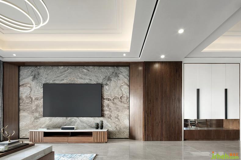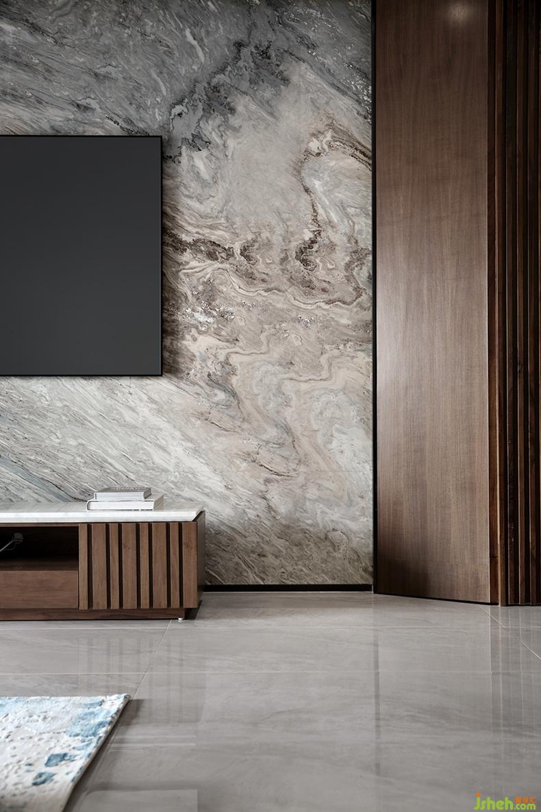 設(shè)計主材:藍金沙大理石云灰石拋釉磚胡桃木拉絲黑鋼德賽斯巖板墻布硬包