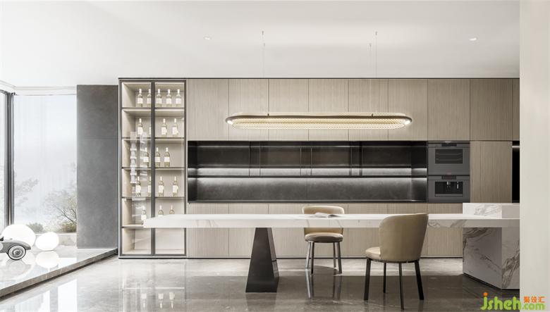 疊墅樣板房設計師在別墅一層的設計中,打破了傳統(tǒng)的客餐廳的布局,讓開放式廚房成為了視覺的中心和所以動線的連結。6200mm的一體化超長餐桌島臺,強調(diào)簡約美學與功能的平衡,提升烹飪的效率及美感,它當然可以輕松滿足家庭的餐廚需求。而通過島臺這個寬敞的社交與自由流通的空間,將其變?yōu)橐粋€吸引所有家人成員活動的磁石,才是本案設計的真正主旨。