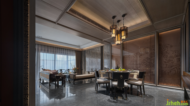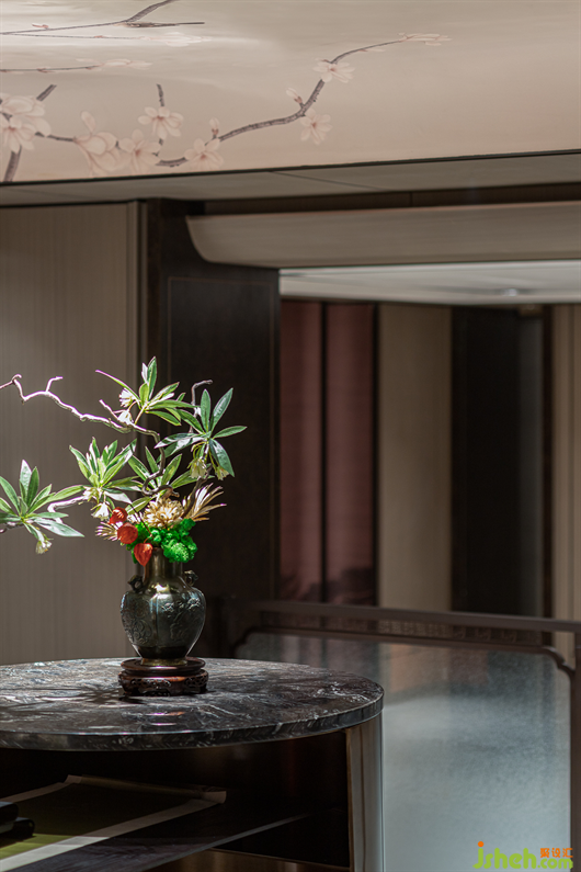 青綠,從《千里江山圖》中走來(lái),在畫中靜待千年,歷經(jīng)千年而未衰,即使在幽暗的環(huán)境中依然泛著寶石的光芒。別墅樣板房設(shè)計(jì)一層的會(huì)客空間,色調(diào)沉靜古樸,墻面的山水畫卷大氣磅礴,彰顯著主人心有丘壑、眼存山河的胸懷與氣度。而點(diǎn)綴其間的青綠是才是整個(gè)空間的靈魂,它才是生命力最強(qiáng)的,就像明月一樣,存在千年。