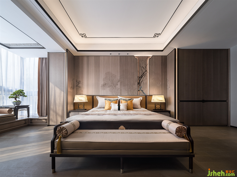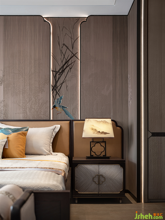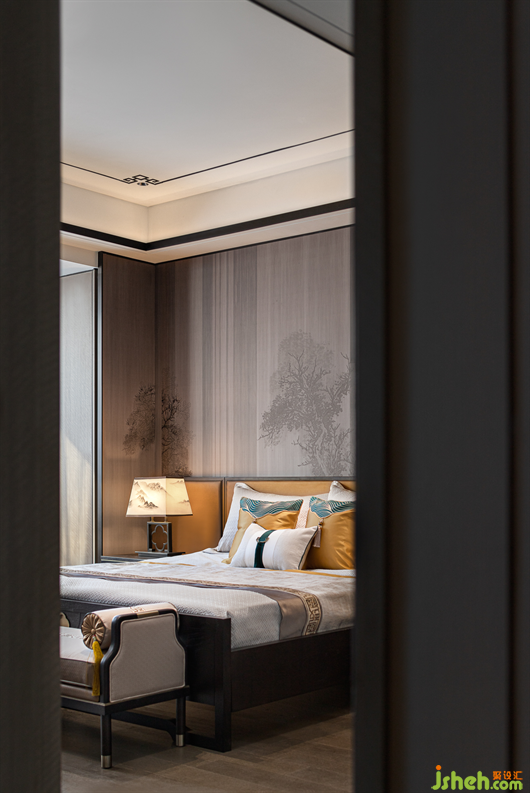 山水相逢,芙蓉入織。經(jīng)過再設(shè)計的芙蓉定制紋樣嵌入了沙發(fā)座椅的暖黃色的絲光面料中,別墅樣板房設(shè)計也鑲刻在了沉郁古樸的木制家具五金細部中。如同氣勢萬千的國畫中,加入一些恰當?shù)慕鈽?gòu)手法,讓畫風更具有辨識度。派尚設(shè)計細膩入微的陳設(shè)藝術(shù)讓整個項目更具辨識度和儀式感,形式簡潔純粹、色調(diào)溫暖,詩性生動而靈韻萬千。
