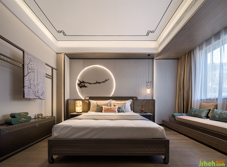 從電梯上至二樓,別墅樣板房設(shè)計映入眼簾的是三幅采用實木雕花工藝的中式元素掛畫,一步一景,穿過走廊,步入至次臥室空間,輕紗一般的陽光穿過碩大的落地窗灑入屋內(nèi)時。深灰色與艾綠、沙石黃的邂逅,磅礴壯美,疏密有度,遠近濃淡如煙波浩淼兼水草豐茂的江湖,不落俗套。