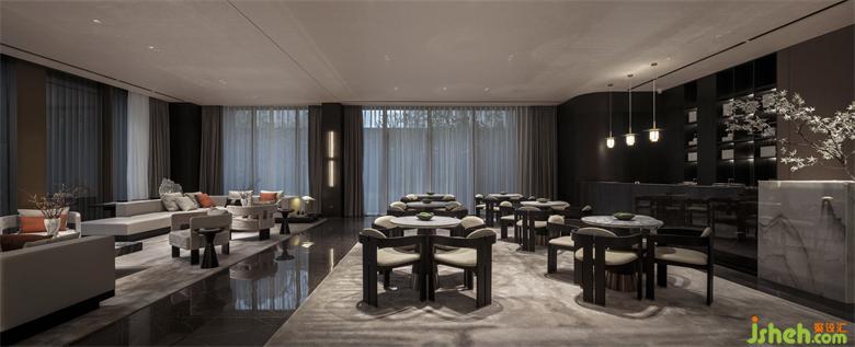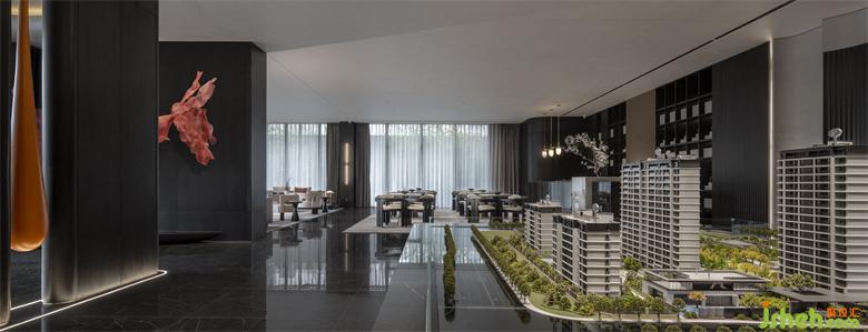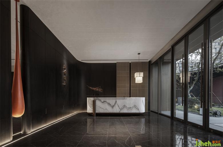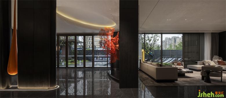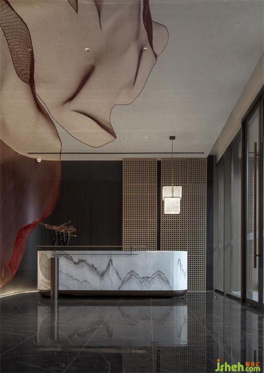 售樓處入口的接待大堂,是一個擁有沉靜安寧氣場的空間,而在這個深色調的空間中,一塊完整的山水紋大理石如同山水長卷般在空間中心徐徐展開,它和極簡的金屬線條構成了接待臺的全部體量,這是一筆點睛的留白之筆,售樓處設計在燈光氛圍的烘托和聚焦之下,人流會像魚群一樣很自然地被吸引過去,如同走向故宮珍寶閣中展開的供人觀賞的千年畫卷。