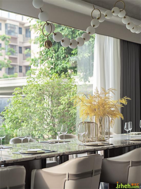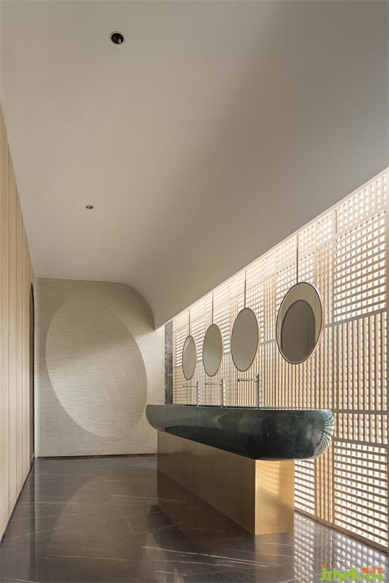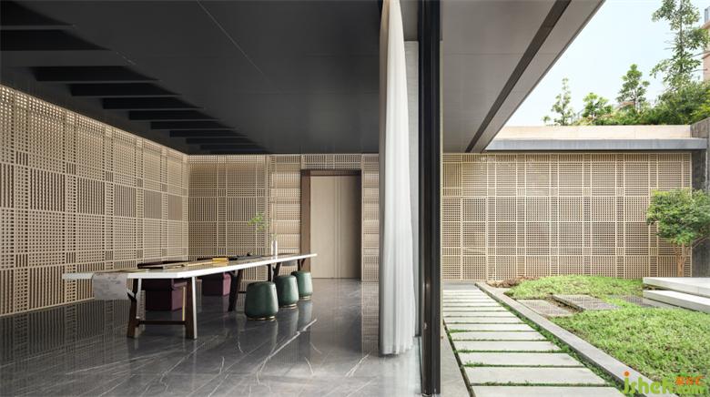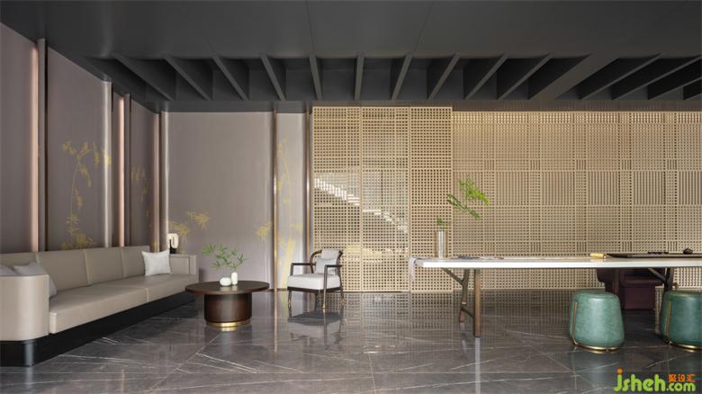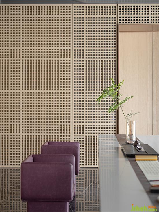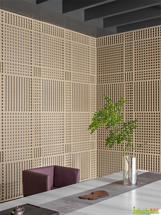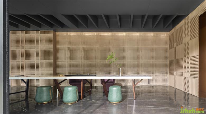 在這里,設(shè)計(jì)師使用了更加內(nèi)斂深沉的色彩, 天花也沒有了外放的弧度。橫平豎直,是空間的風(fēng)骨和胸襟;隔柵錯(cuò)落,將疏朗通透,兼蓄秀茂帶入其中。