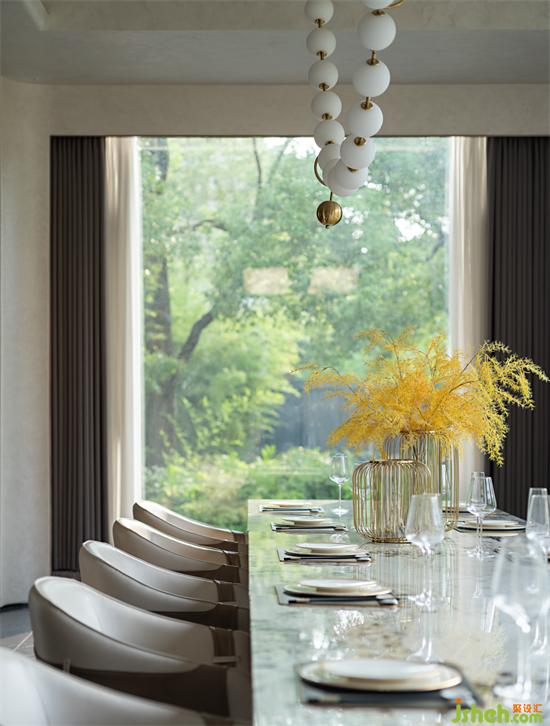 整個(gè)茶室兼書房造型輕巧靈活,開敞通透??晒┎柚魅司毩?xí)書法、以茶會(huì)友的長(zhǎng)桌面對(duì)的是下沉庭院最好的景觀。