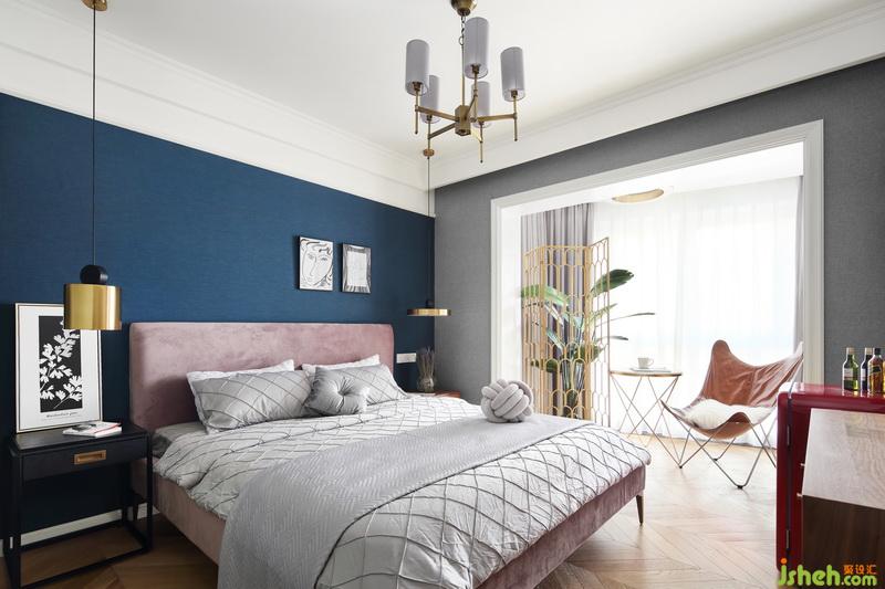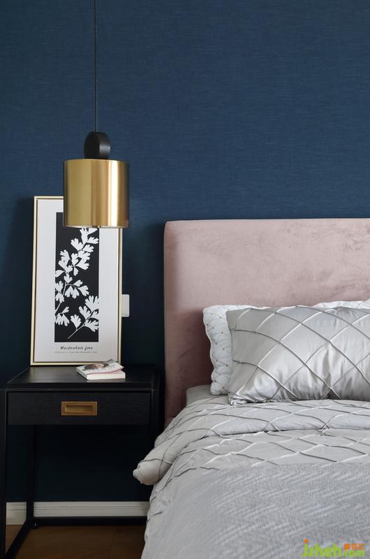 灰粉色和墨藍(lán)色搭配出適合休憩的空間,同時又不失時尚感。