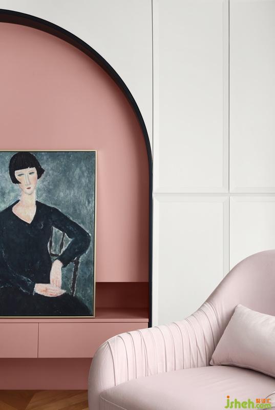 餐廳以黑白灰為主要色調(diào),然后用粉色的餐椅和黃色的裝飾畫來柔化空間的質(zhì)感,增添餐廳空間的活潑度。餐邊柜同時也兼具個性和美感,還呼應(yīng)了電視柜的弧形元素。