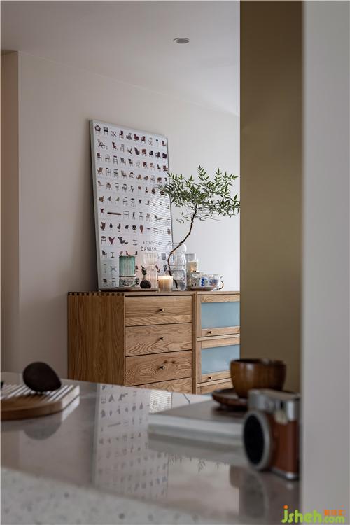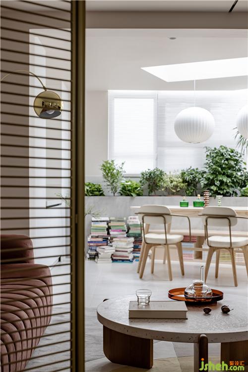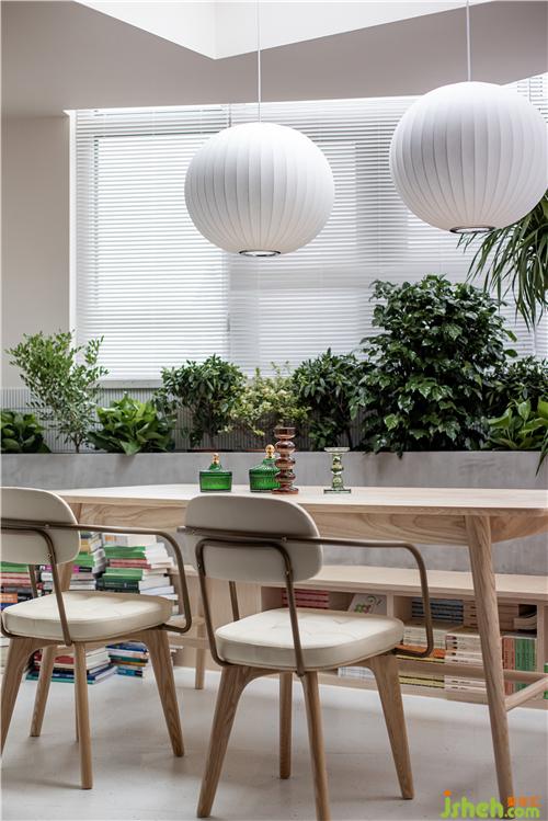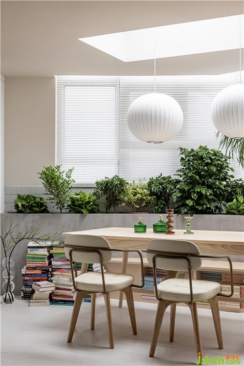 餐廳將戶外陽臺封閉,開設(shè)天窗,增加植物景觀,下設(shè)木制卡座,集合書柜,搭配原木色餐桌與皮制餐椅進(jìn)行混搭,整體色系將客廳空間與餐廳空間氛圍融合過渡。 餐廳卡座同樣選用原木色搭配,一反復(fù)古常態(tài)。