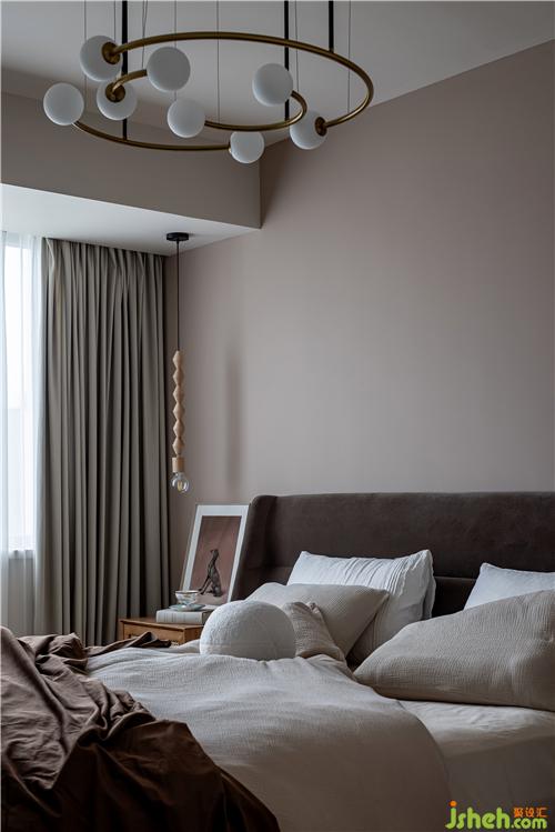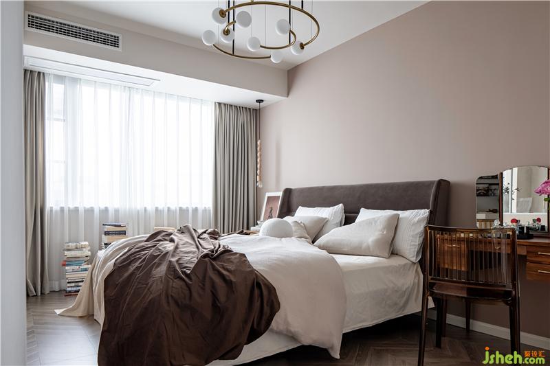 主臥室同樣采用溫柔大地色系和整體進行呼應(yīng),咖色絨布床頭和棉質(zhì)床品,讓家居氛圍更加溫馨。室內(nèi)設(shè)計師