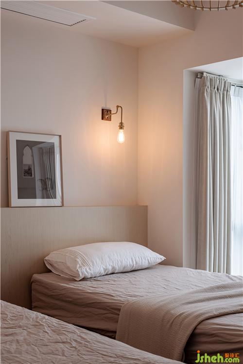 次臥室采用雙單人床設(shè)計,方便父母偶爾來住時可分床休息,平時也可二床合一,業(yè)主可在此觀看投影。