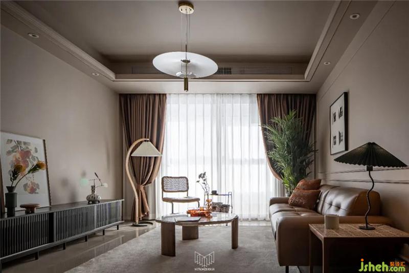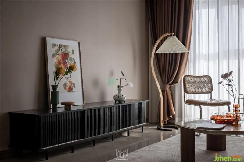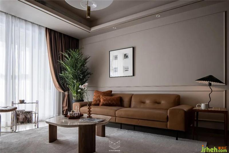 摩登復(fù)古質(zhì)感的CAMPAIGN三人沙發(fā),寬扶手設(shè)計(jì)可充當(dāng)臨時(shí)的置物平臺(tái),南京裝修設(shè)計(jì)沙發(fā)兩側(cè)分別是MUNA柚木花磚邊幾,與筑物片刻金屬雜志架。