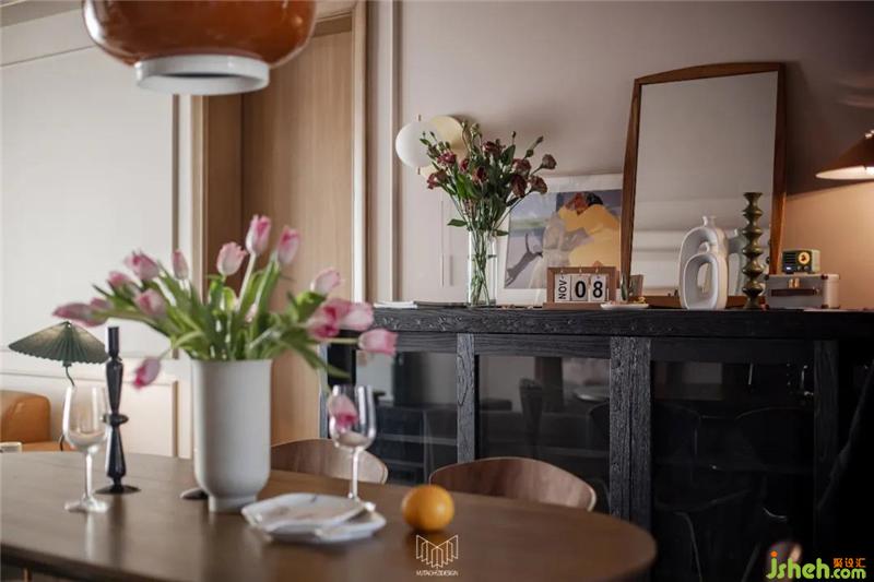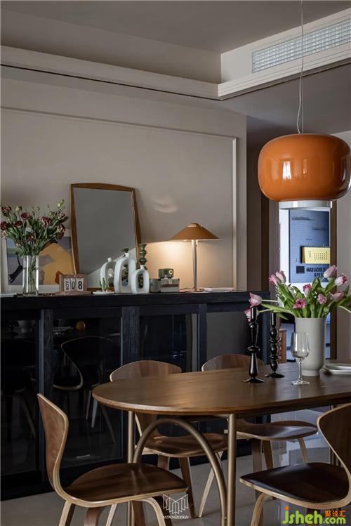 深色美國黃楊木床頭柜與楊木斗柜,黑色鐵椅腿,細(xì)金屬拉手小細(xì)節(jié)元素與款式的呼應(yīng)。