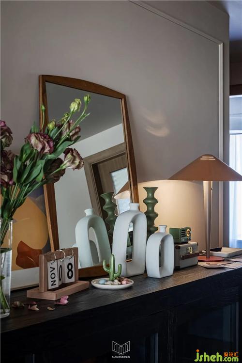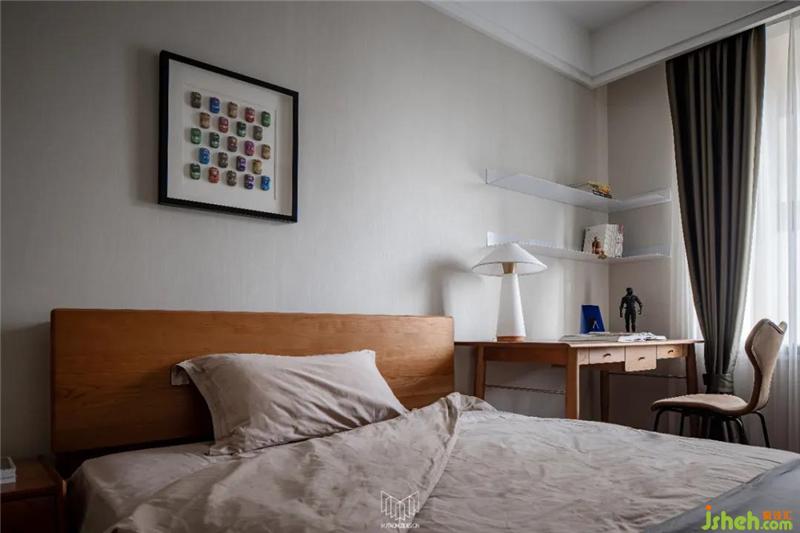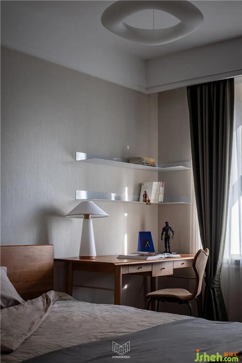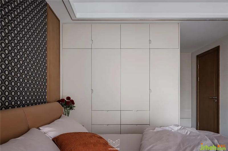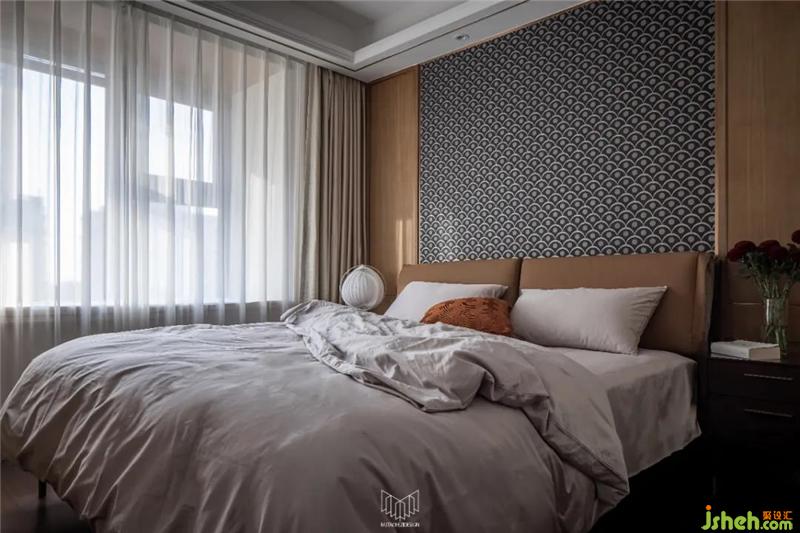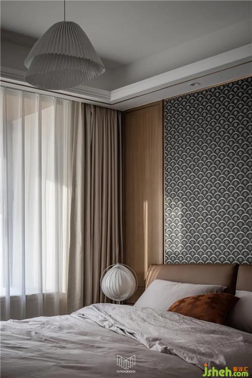 主臥沿用咖色系搭配灰色系床品,與保留的原有床頭背景協(xié)調(diào)。南京裝修設(shè)計局部改造背景軟包,搭配英國Harlequinh LEONIDA玻璃珠顆粒黑色壁紙盡顯摩登風(fēng)味。