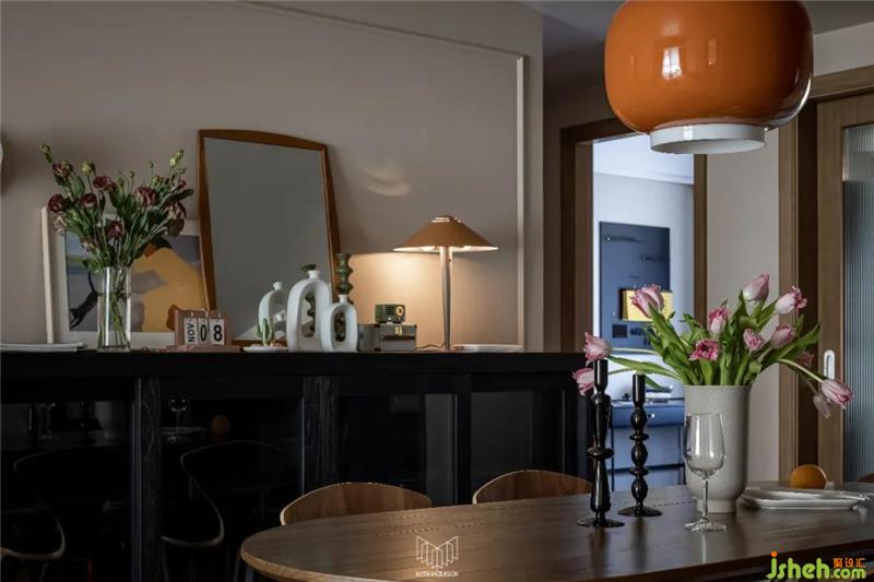 在硬質(zhì)材料的搭配中選用西班牙Arturo alvarez Tempo燈具調(diào)和空間感,使用彩繪不銹鋼網(wǎng)仿制制藝的視覺感受。與客廳的Poul Henningsen落地?zé)艉魬?yīng)。
