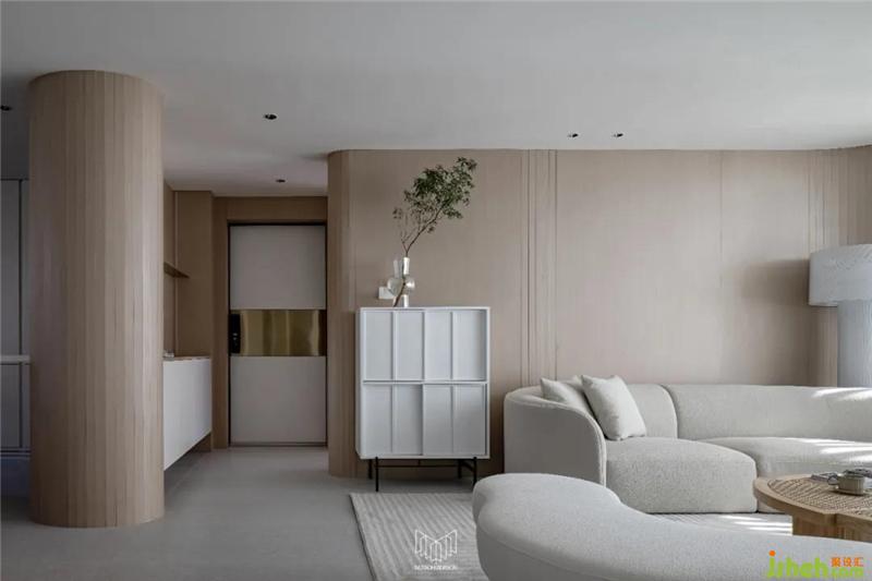 門廳部分定制柜體,柜體運用流體造型,在保證儲物量的同時,流體造型能夠凸顯空間的溫暖氛圍,并使視線平穩(wěn)的過度到客、餐廳。