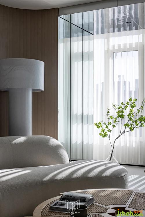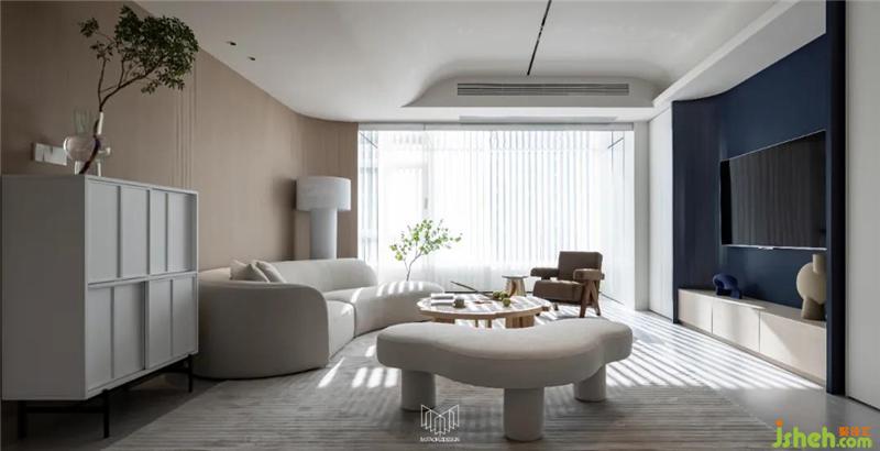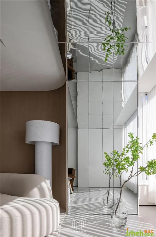 原陽臺擴容至客廳,增加客廳面積,以羊羔絨、藤編元素家具點明自然主題,電視柜造型與鞋柜、島臺相呼應,定制鏡面柜門和鏡面不銹鋼吊頂,讓整體空間更加大氣明亮。
