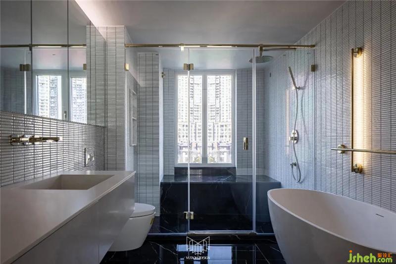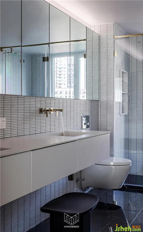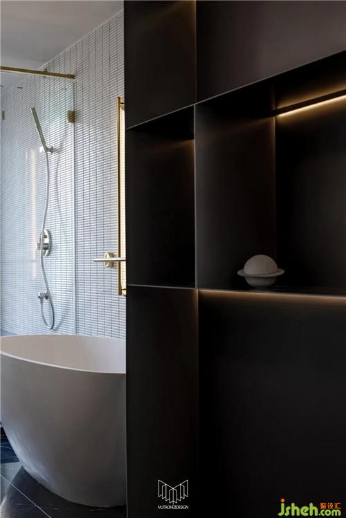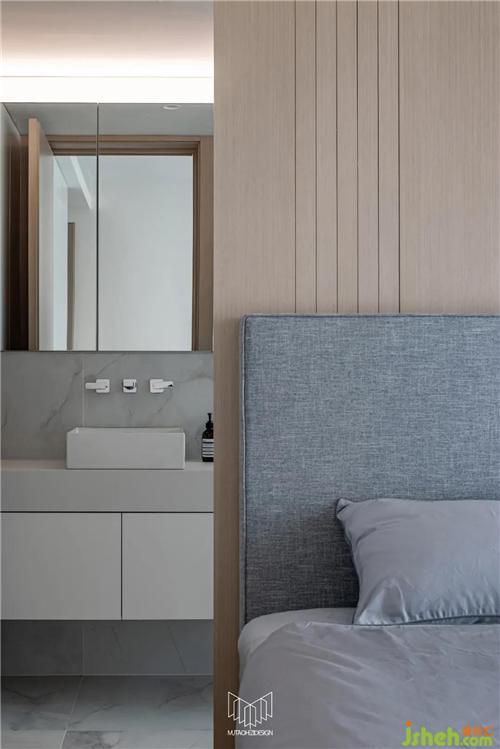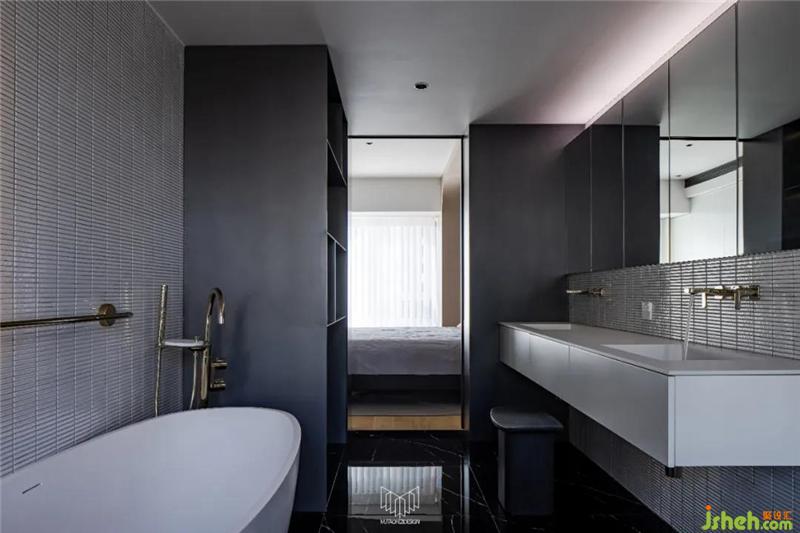 主衛(wèi)墻體拆除后,使用定制柜體和鋼板柜替代隔墻功能,衛(wèi)生間擴(kuò)大后,功能更加多樣化,不僅滿足基礎(chǔ)盥洗功能,更配備了雙臺(tái)盆巖板一體盆和浴缸。定制柜體內(nèi)嵌燈光以襯托整體氛圍,色彩、材質(zhì)也與主臥室融合呼應(yīng),極大了提高了生活品質(zhì),形成套房概念。