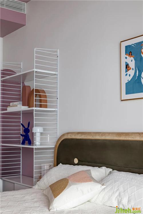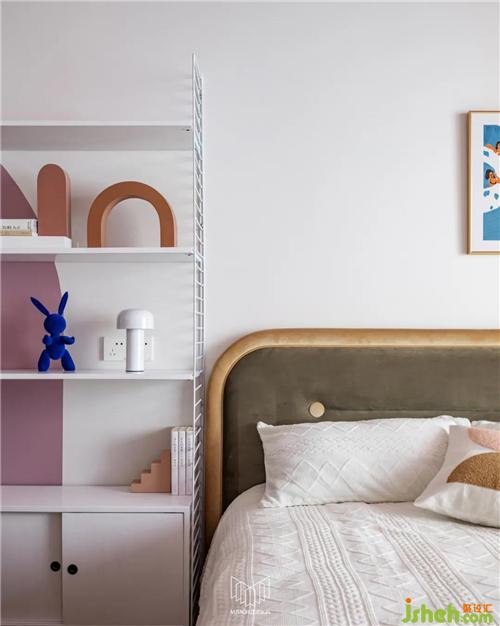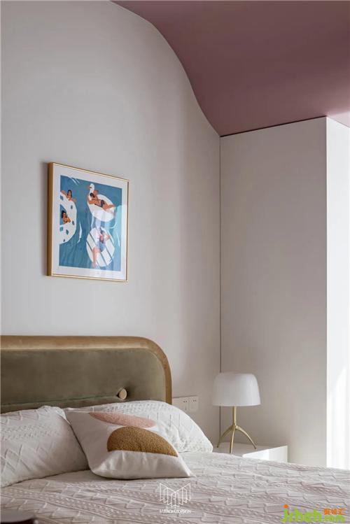女兒房原有面積較小,考慮到業(yè)主女兒的日常功能需求,將陽臺歸納至房間,并運(yùn)用流體手法弱化頂面門梁的存在感,在容納鋼琴和書桌的同時多配備一組儲物柜,余下空間更可放置一個與女孩房風(fēng)格相近的成品柜體,借此增加空間的趣味性。