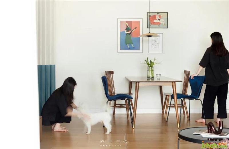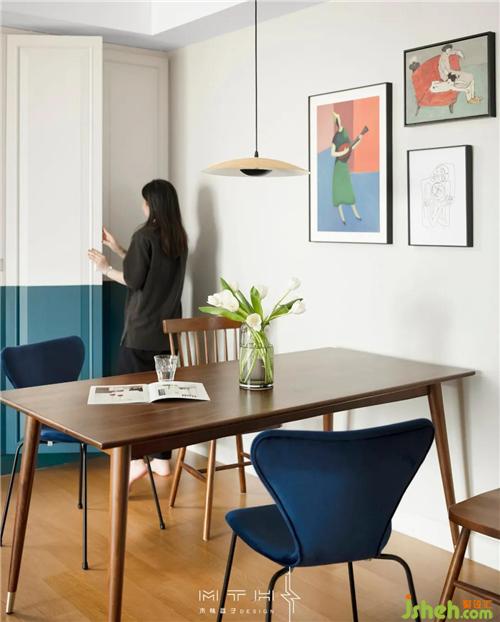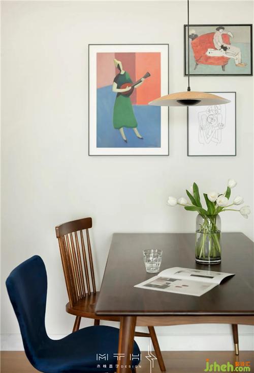 餐廳選用了兩款不同材質(zhì)和造型的餐椅,搭配胡桃木餐桌,既平衡又統(tǒng)一。南京裝修設(shè)計(jì)墻面也選擇色彩跳躍的組合裝飾畫(huà),增添了空間的趣味性。