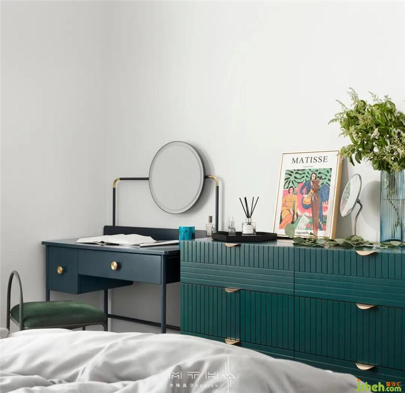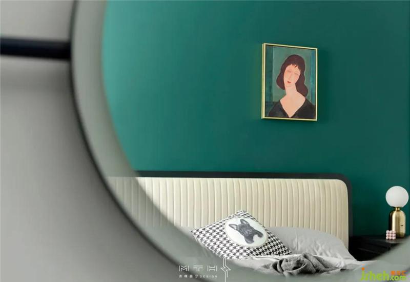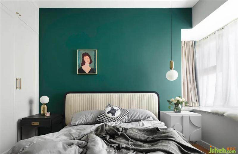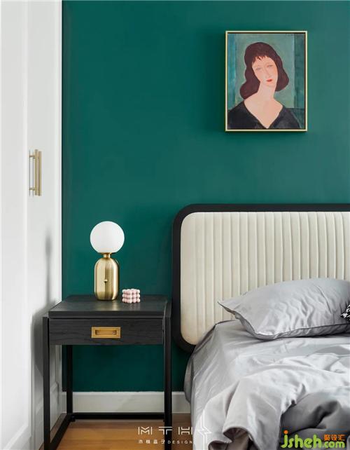主臥室背景墻整面刷墨綠色乳膠漆,床頭選擇了一幅阿梅代奧·莫迪利亞尼的金色邊框人物肖像畫(huà),畫(huà)的背景同樣也是藍(lán)綠色,南京裝修設(shè)計(jì)搭配在一起讓墻面更具層次感。床頭兩側(cè)臺(tái)燈和吊線燈組合布光,也增加了空間的裝飾效果。