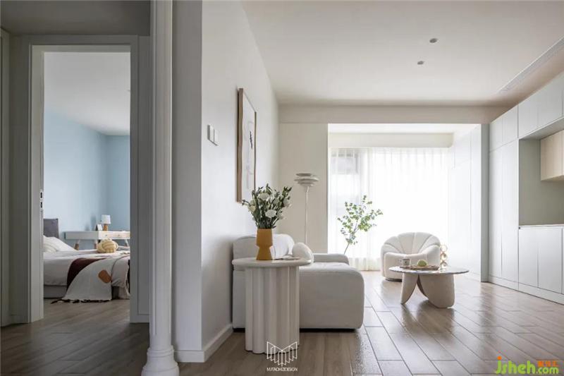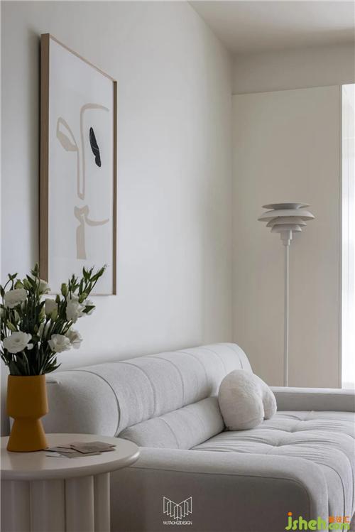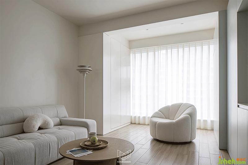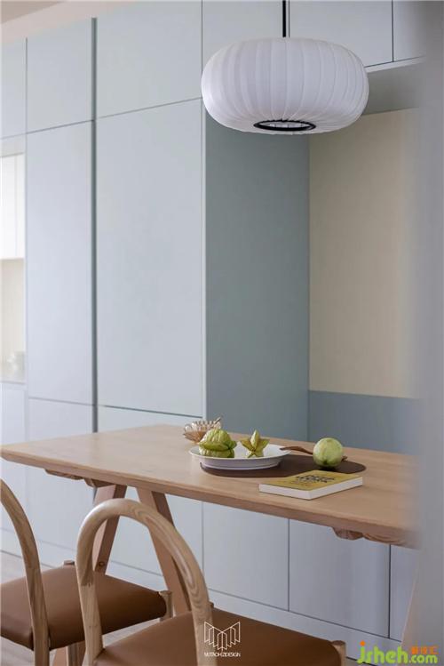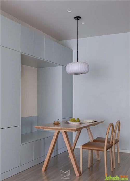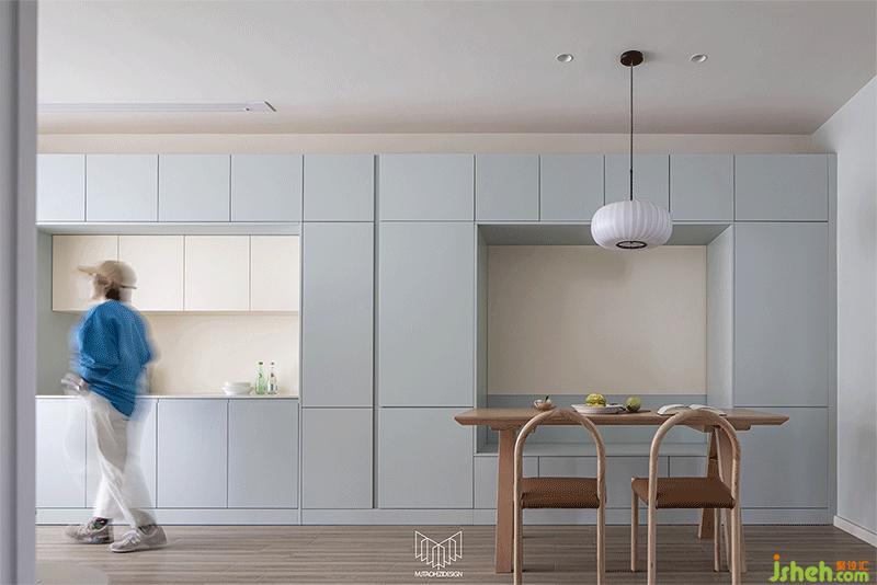 陽(yáng)臺(tái)空間歸納給客廳,將洗衣柜和烘干機(jī)內(nèi)置。陽(yáng)臺(tái)柜可放置雜物,吸塵器等,也可作為家中鞋類的一個(gè)補(bǔ)充放置儲(chǔ)藏。