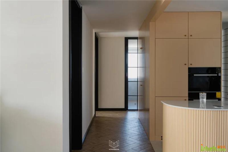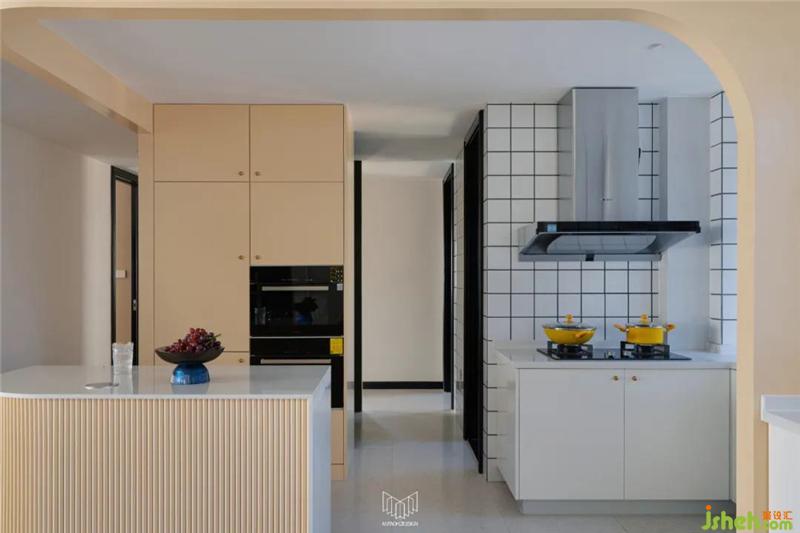 拆除廚房及過道部分墻體,擴大空間,讓吧臺和過道中島區(qū)融為一體,動線更合理。