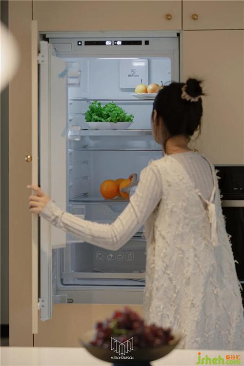 設計吧臺位,并在背后砌墻體定制柜體,并內(nèi)嵌冰箱、烤箱、蒸箱,南京室內(nèi)設計師吧臺下方也內(nèi)嵌小冰柜,滿足日常使用。